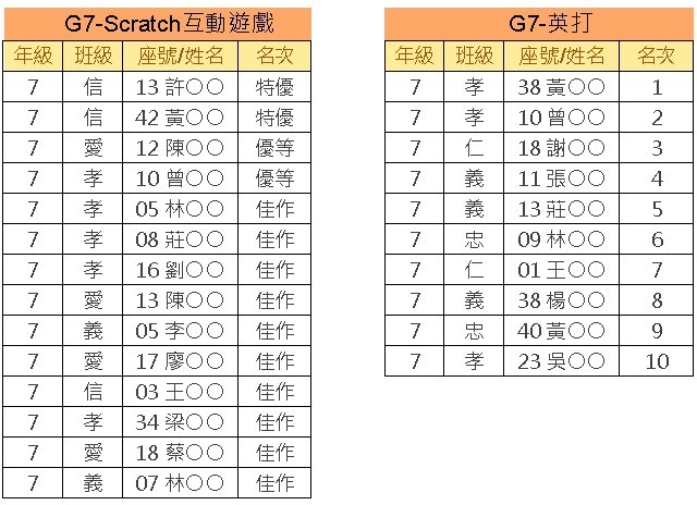 112學年度校內資訊應用競賽 (七年級得獎名單)