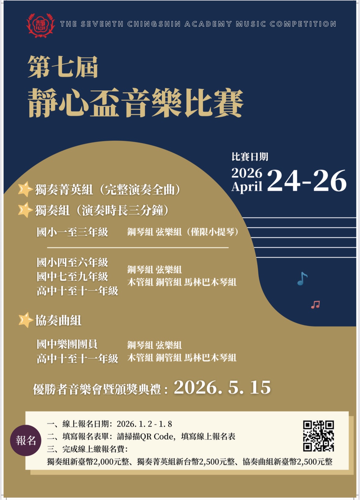 ※第七屆靜心盃音樂比賽線上報名日期:2026. 1. 2 (五) ~ 1. 8 (四)